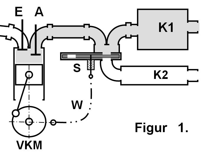 Zum Aufbau . Figur 1 zeigt eine schematische Darstellung des Aufbaus eines Abgastraktes einer herkömmlichen Viertaktmaschine VKM mit angeschlossenem Drehschieberventil S und dem Expansionsvolumen (Schalldämpfer) K1. Das Drehschieberventil S ist über eine flexible Welle W mit dem mechanischen Abtrieb der Verbrennungskraftmaschine VKM verbunden. In Figur 1 sind die Ladungswechselorgane der Verbrennungskraftmaschine, das Einlassventil E und das Auslassventil A schematisch dargestellt. Mit dem Drehschieberventil S ist das sekundäre Kesselvolumen K2 verbunden, das wie das Expansionsvolumen (Schalldämpfer) K1 einen Ausgang zur atmosphärischen Umgebung des Motors besitzt.