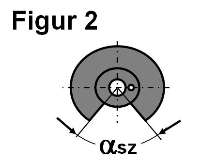 Dauer und Verlauf der Öffnung des Drehschieberventils S werden über die konstruktive Ausgestaltung der Paarung Drehschiebergehäuse und Drehschieberplatte festgelegt. Dabei kommt der Antriebsdrehzahl des Drehschiebers und die zeitliche Synchronisation (Phase) mit der Verbrennungskraftmaschine eine entscheidende Rolle zu. Figur 2 zeigt schematisch einen asymmetrischen Plattendrehschieber, der mit der halben Kurbelwellendrehzahl der Verbrennungskraftmaschine betrieben wird. Der signifikante Öffnungsmaß-Winkel a sz, bestimmt die Steuerzeiten des Drehschieberventils.